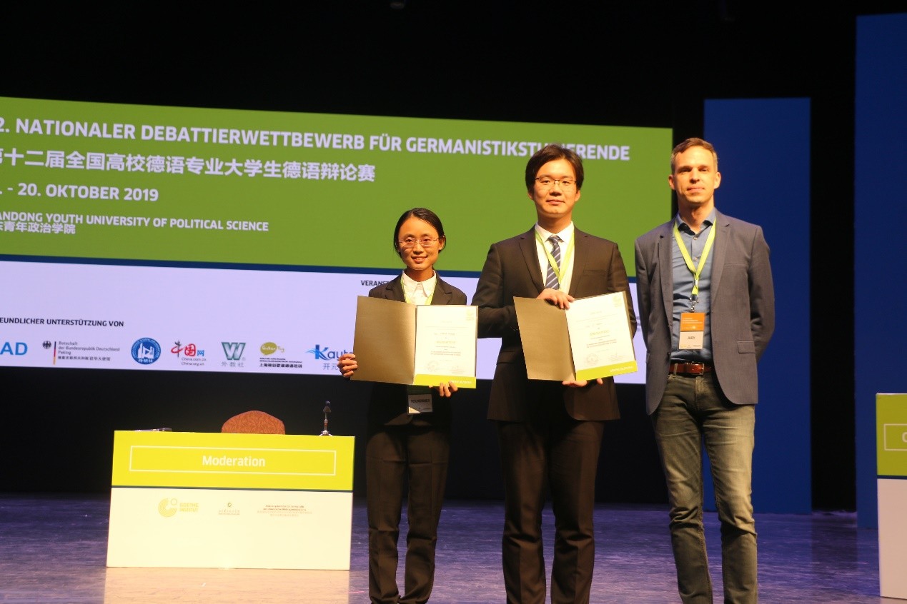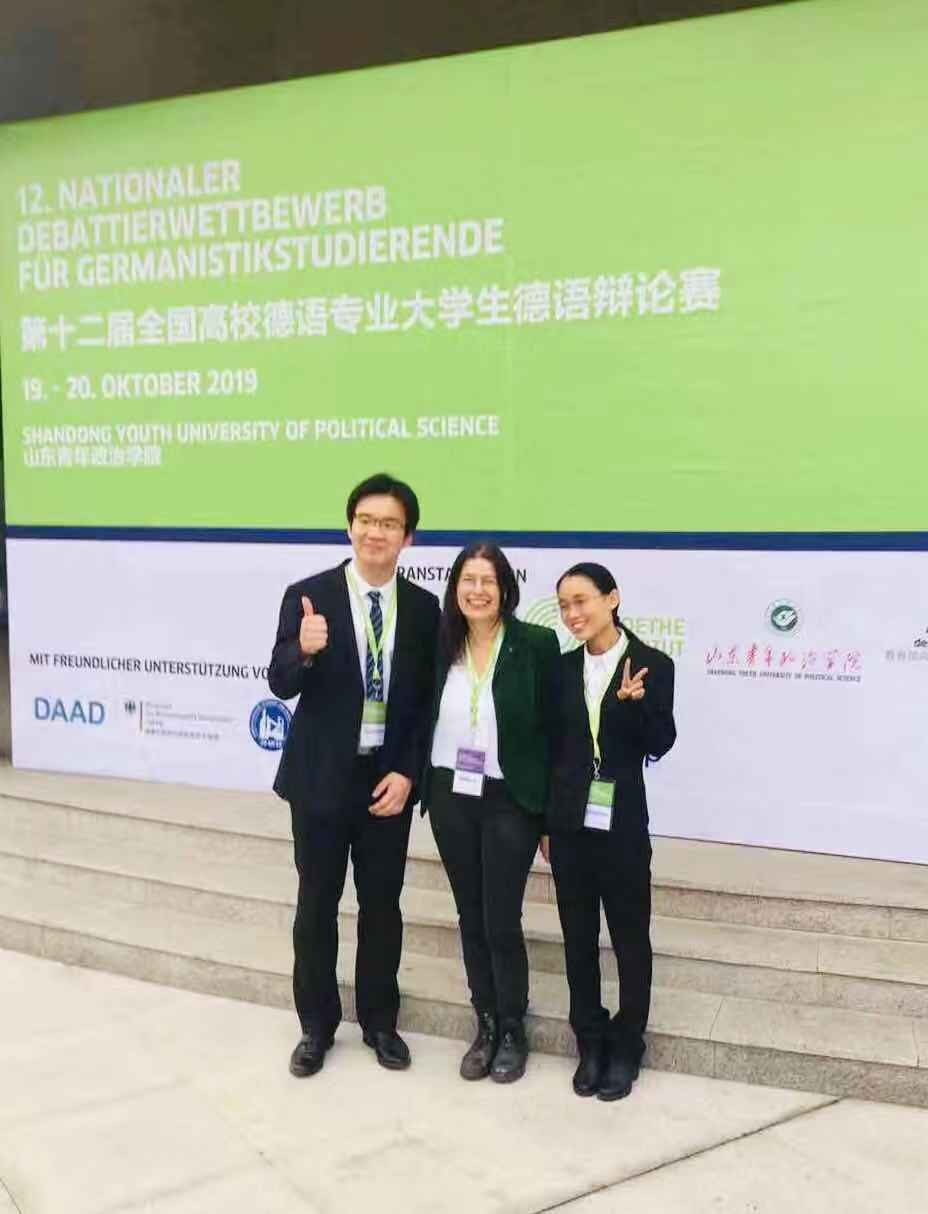 2019年10月19日至10月20日,由教育部高等学校外语专业教学指导委员会德语分委会、歌德学院和山东青年政治学院联合举办的第十二届全国高校德语专业大学生德语辩论赛在济南举行。太阳成集团tyc33455cc官网德语系2016级本科生张皓莹和李牧翰在葛思乐(Christine Gessler-Unthan)老师的率领下,经过两天的激烈角逐,在来自全国各地高校德语专业的48支队伍中突破重围,力克群雄、勇夺冠军。