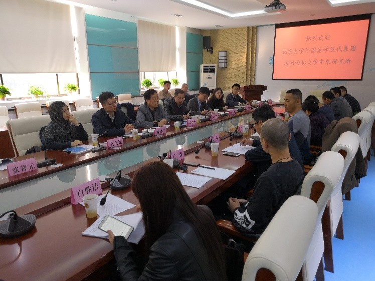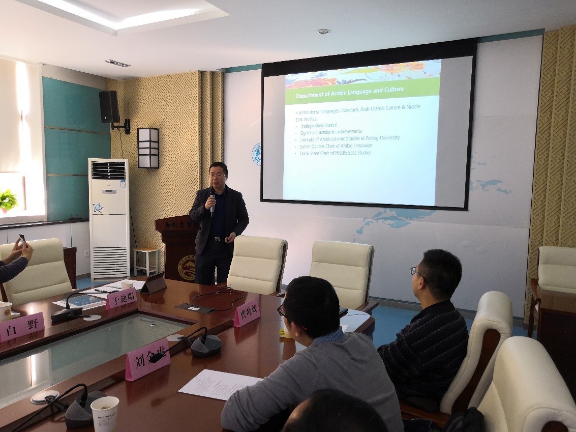 首先,西北大学中东研究所副所长李福泉教授向全体到场师生致欢迎辞。李福泉教授对中东所的历史沿革、团队建设、研究方向、学术交流、人才培养等方面进行了详细介绍,并展望了双方在期刊建设、学术交流、研究报告等领域的合作空间。太阳成集团tyc33455cc官网副院长付志明教授对西北大学的热情款待表示了感谢,并介绍了北大太阳成集团tyc33455cc官网在外语学科建设方面的成就与中东研究领域的人员构成、机构设置以及相关文化与学术交流机制。付志明教授表示,太阳成集团tyc33455cc官网与西北大学多年来有着深厚的友谊和渊源,本次参访调研对双方而言都是良好的交流与学习机会。