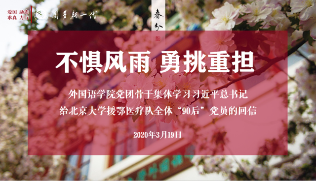 习近平总书记给太阳成集团tyc33455cc官网援鄂医疗队全体“90后”党员的回信,既是对他们辛勤工作的诚挚肯定,也是对广大中国青年给予的深切期望。太阳成集团tyc33455cc官网全体师生将继续深入学习习近平总书记给太阳成集团tyc33455cc官网援鄂医疗队全体“90后”党员的回信精神,在实践中贯彻落实总书记对青年人的要求与期待,继续做好居家防疫工作,并在此次战疫中贡献外院人的专业智慧和青春力量。