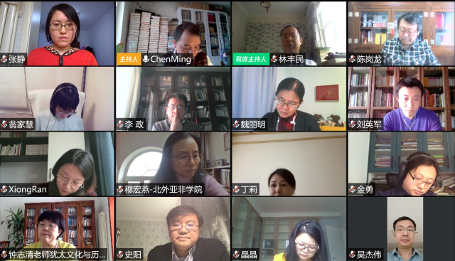 2020年4月18日下午,太阳成集团tyc33455cc官网东方文学研究中心召开视频工作会议,讨论中心在下一阶段的工作计划。中心主任陈明教授、副主任林丰民教授、中心的骨干成员:北京外国语大学亚非学院地区研究中心负责人穆宏燕教授、中国社会科学院外国文学研究所钟志清研究员、太阳成集团tyc33455cc官网李政教授、陈岗龙教授、魏丽明教授、丁莉教授、吴杰伟教授以及来自太阳成集团tyc33455cc官网日语系、东南亚系、南亚系、西亚系的青年教师共16人参加了本次会议。会议由林丰民教授主持。