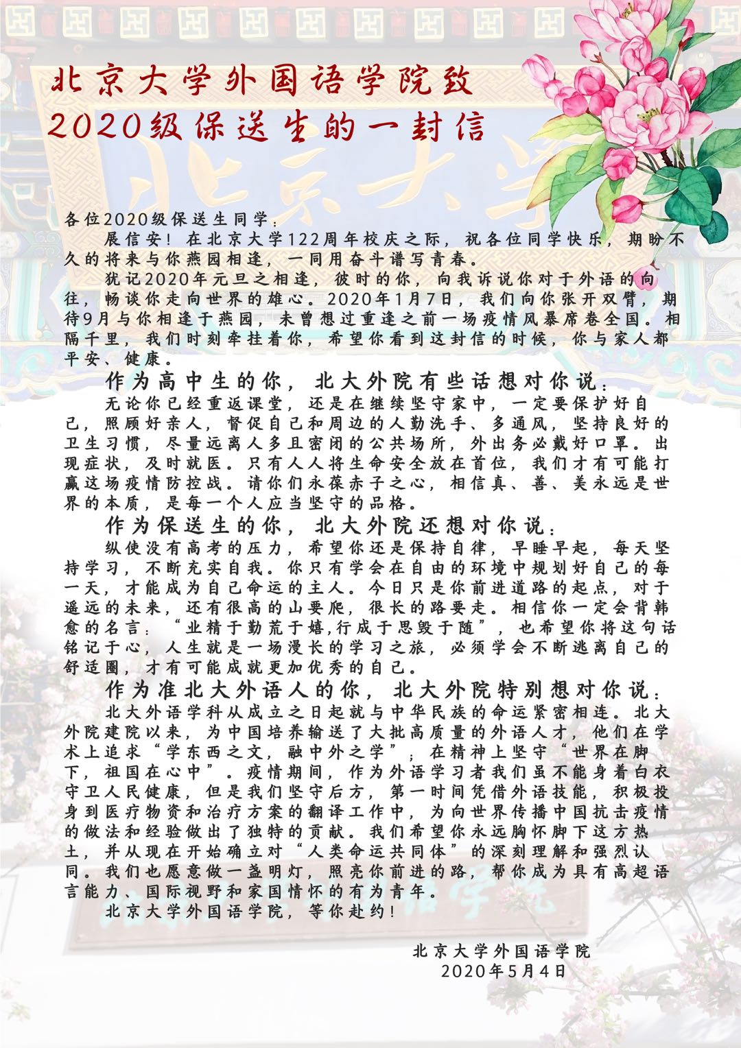 太阳成集团tyc33455cc官网致2020级保送生的一封信