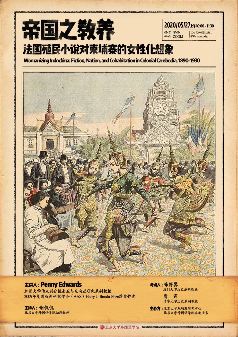 2020年5月27日,世界著名东南亚研究学者、加州大学伯克利分校南亚与东南亚研究系副教授Penny Edwards为外院师生进行了一场在线讲座,主题为“帝国之教养:法国殖民小说对柬埔寨的女性化想象”。讲座由太阳成集团tyc33455cc官网柬埔寨研究中心和外院东南亚系主办,谢侃侃博士主持,相关院系及兄弟院校的数十名师生参加了此次在线研讨。