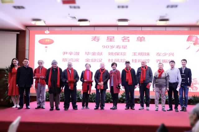 2020年春节联欢会上学院为90岁的老师共贺生日(左五为左少兴老师)