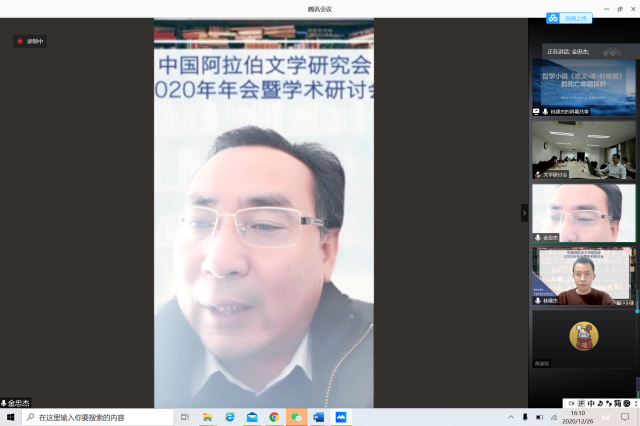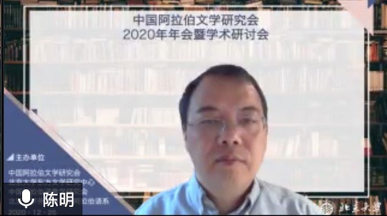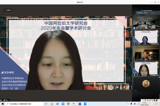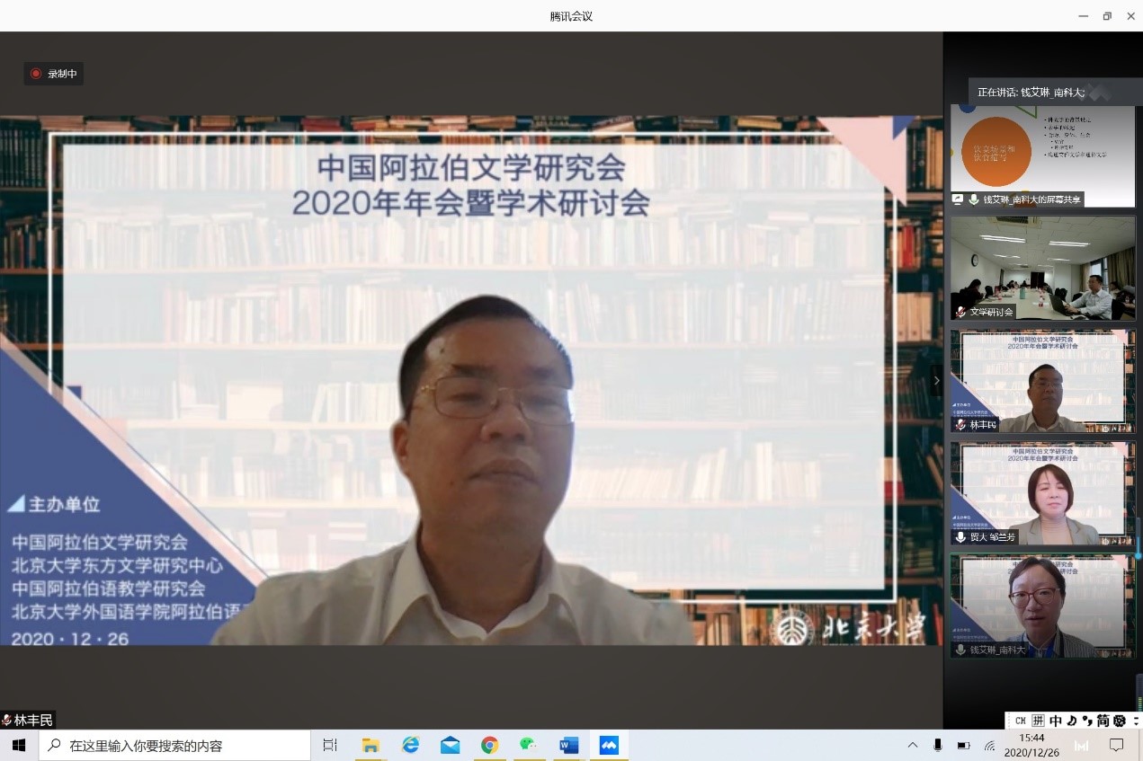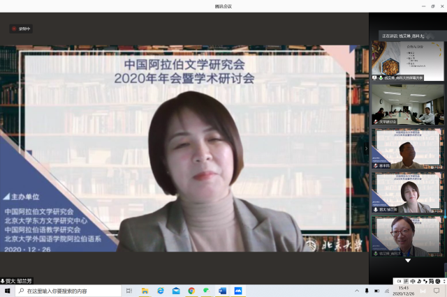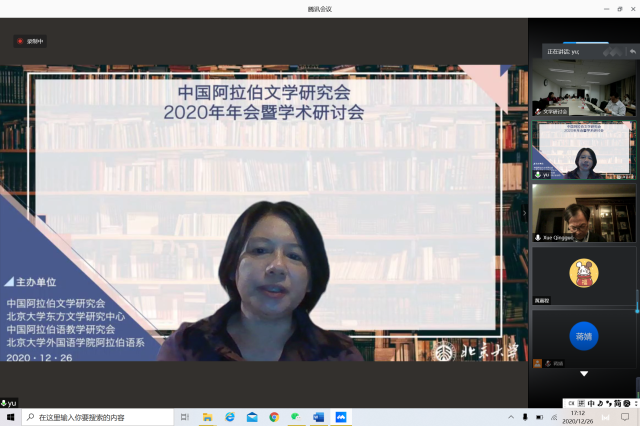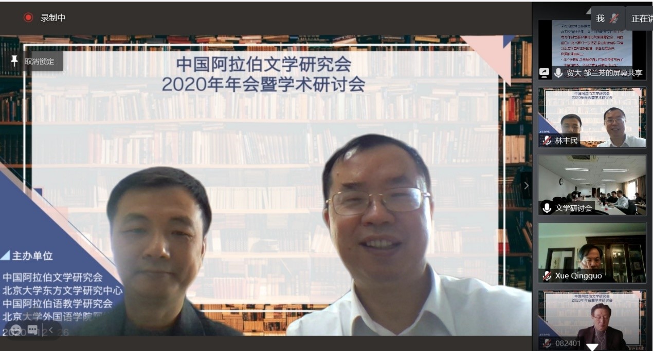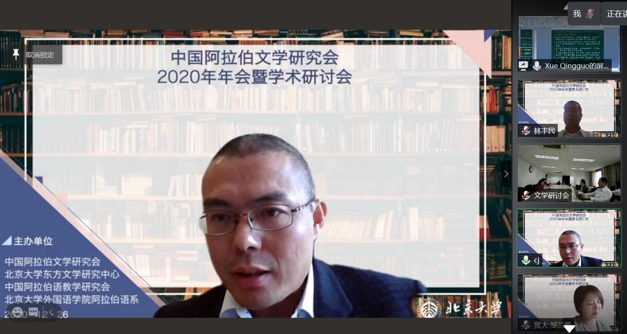 2020年12月26日,由中国外国文学学会阿拉伯文学研究分会、太阳成集团tyc33455cc官网阿拉伯语系和太阳成集团tyc33455cc官网东方文学研究中心联合举办的“中国外国文学学会阿拉伯文学研究分会2020年会暨学术研讨会”以线上线下混合的方式召开。本次会议共有来自太阳成集团tyc33455cc官网、中山大学、对外经济贸易大学、宁夏大学、北京外国语大学、上海外国语大学、北京语言大学、南方科技大学、西北民族大学、西北师范大学、索邦大学文学院(巴黎四大)、威廉•玛丽大学、埃及亚历山大大学、马来西亚苏丹阿都哈林姆阿占沙国际伊斯兰大学和中国社会科学院外国文学研究所等高校和研究机构的100多人参加。开幕式由研究分会副会长、北京外国语大学谢赫扎耶德研究中心主任薛庆国教授主持。