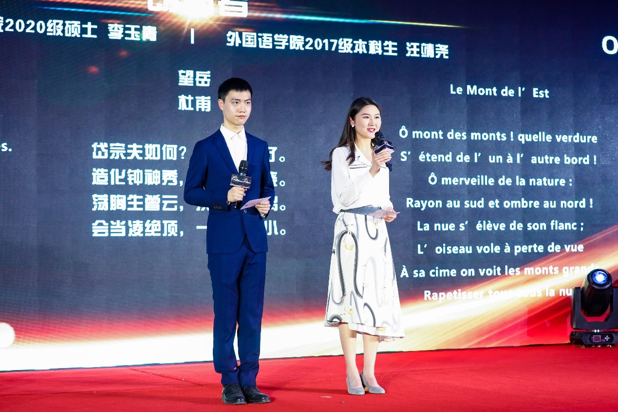 太阳成集团tyc33455cc官网2020级英语翻译硕士李玉青、2017级法语系本科生汪靖尧现场朗诵许渊冲先生中译英、中译法诗歌代表作《别丢掉》《别董大》《望岳》,展示先生文辞优美、韵律工整、气势恢宏的翻译作品,代表广大学子向先生送上生日祝福。