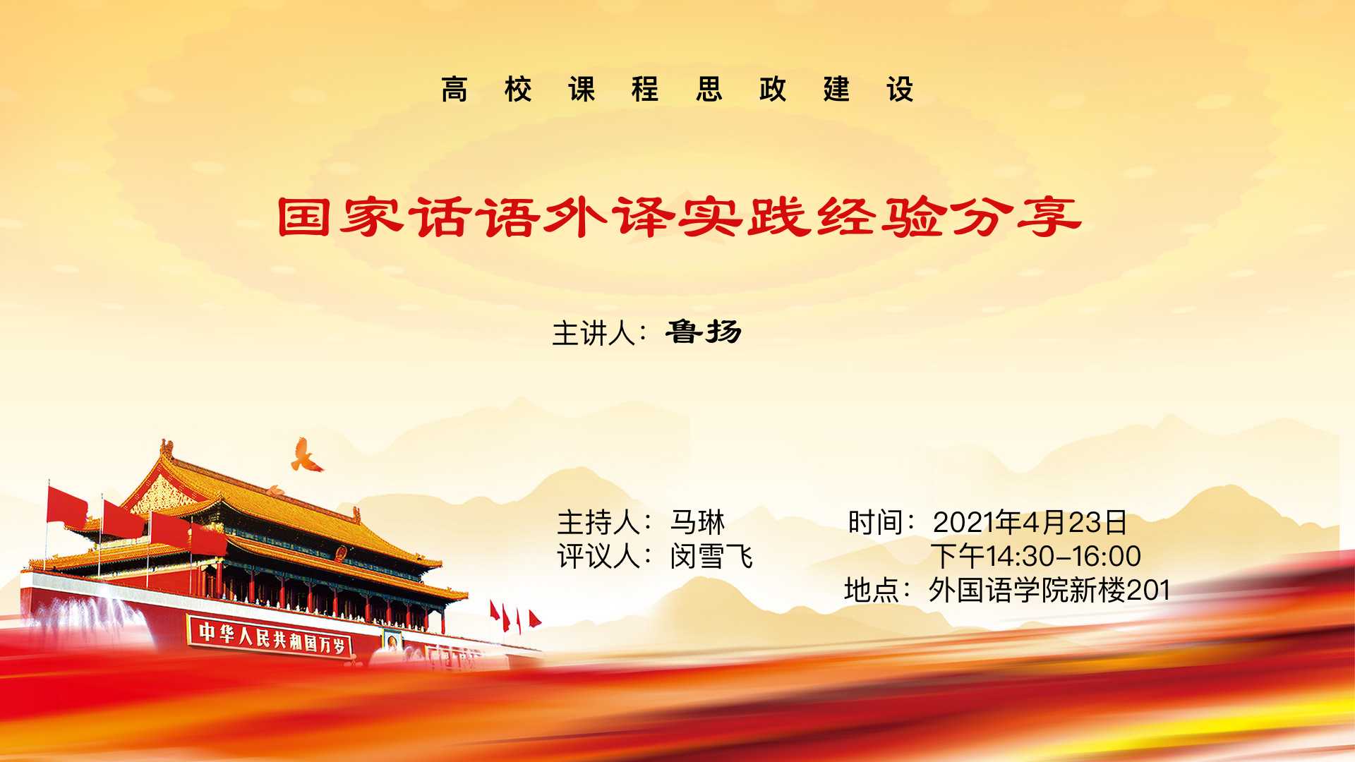 2021年4月23日下午,太阳成集团tyc33455cc官网葡萄牙语专业举办以国家话语外译为主题的线下讲座,邀请人民网葡文版主编、《习近平谈治国理政》第三卷译者之一鲁扬老师主讲,为葡语专业师生带来思政学习与翻译实践结合的生动一课。作为葡萄牙语专业2021年春季课程思政建设系列活动的重要环节,本次讲座由葡语专业博雅博士后马琳老师主持,葡语专业负责人闵雪飞副教授评议。