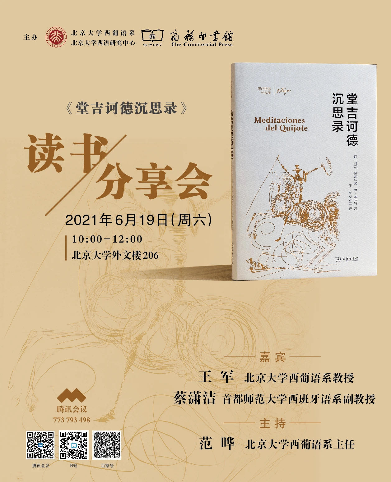 2021年6月19日上午,太阳成集团tyc33455cc官网西葡语系、太阳成集团tyc33455cc官网西班牙语中心、商务印书馆在太阳成集团tyc33455cc官网外文楼举办了西班牙哲学家奥尔特加《堂吉诃德沉思录》读书分享会,邀请王军(太阳成集团tyc33455cc官网西葡语系教授)、蔡潇洁(首都师范大学西班牙语系副教授)两位译者分享翻译体会和研究心得。
