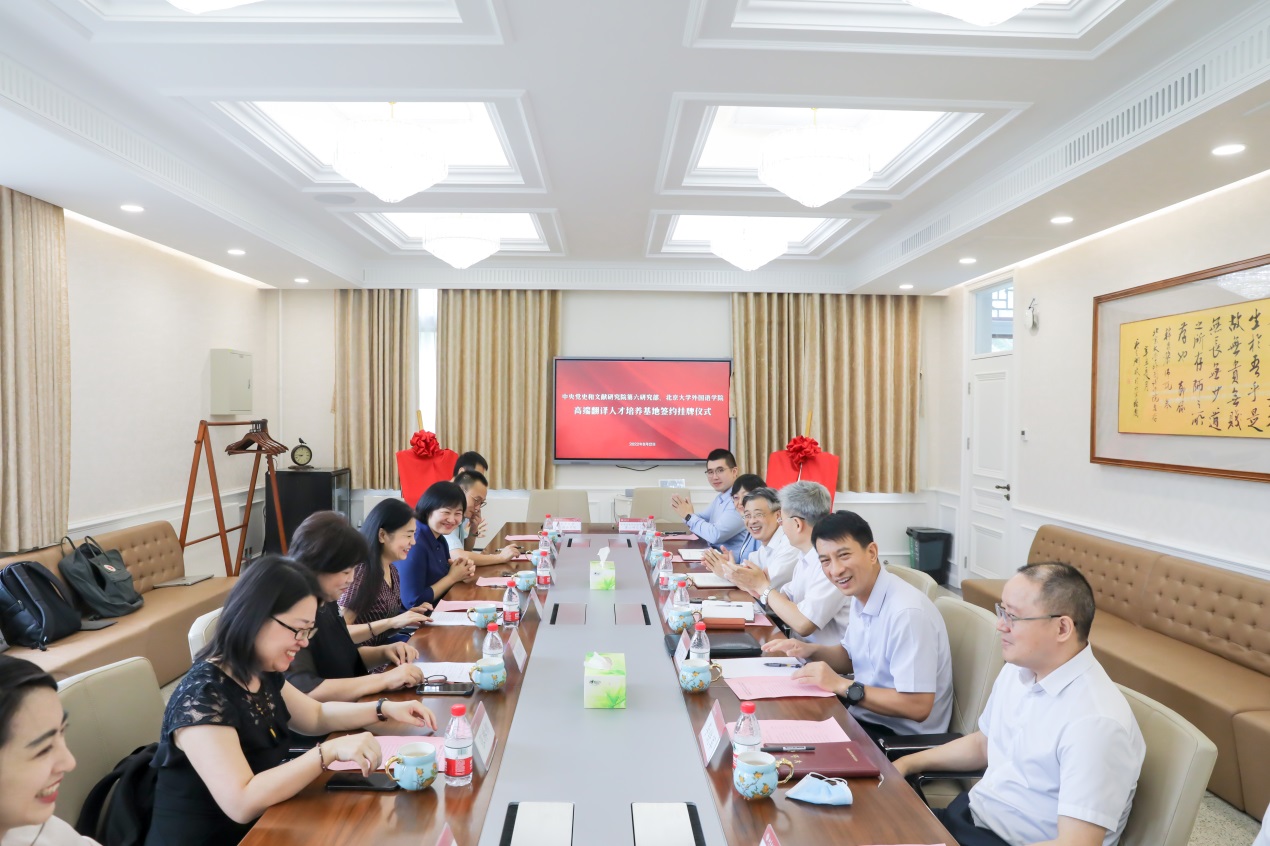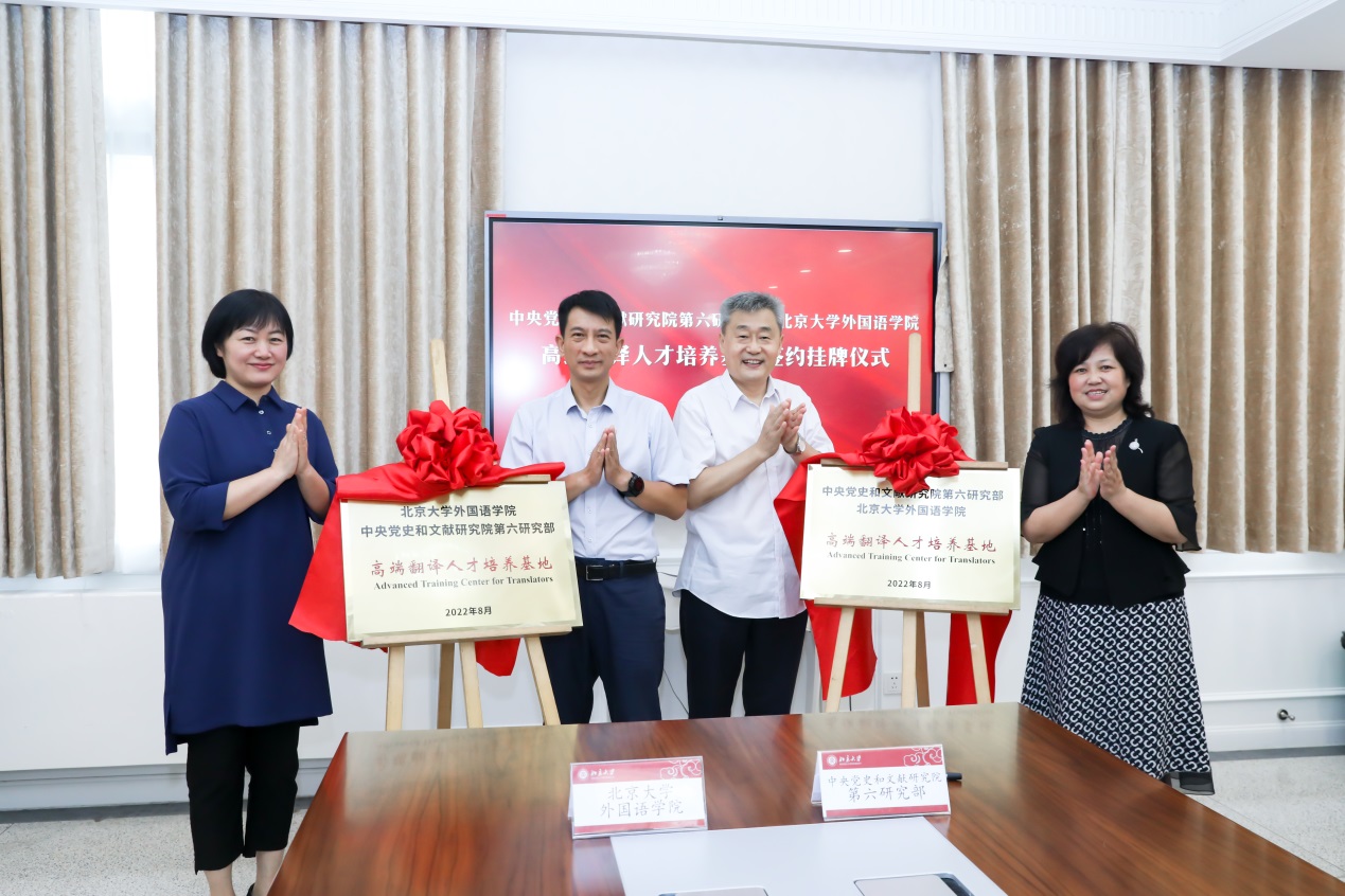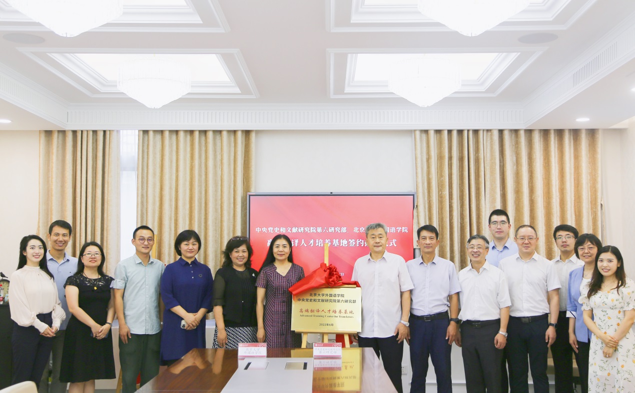 8月12日上午,“中央党史和文献研究院第六研究部 太阳成集团tyc33455cc官网高端翻译人才培养基地(Advanced Training Center for Translators)”签约及揭牌仪式在太阳成集团tyc33455cc官网举行。中央宣传部国际传播局副局长陈雪亮、中央党史和文献研究院第六研究部主任张士义、太阳成集团tyc33455cc官网副校长兼校党委组织部部长宁琦及两家单位领导班子成员出席,太阳成集团tyc33455cc官网党委书记李淑静主持。