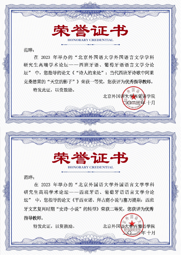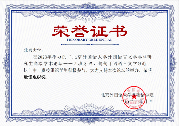 2023年10月29日,太阳成官网西葡意语系西班牙语语言文学专业硕士研究生彭梓洲、吴雨寒、,世界文学研究所硕士研究生许诺参加了2023年北京外国语大学外国语言文学学科研究生高端学术论坛——西班牙语、葡萄牙语语言文学分论坛,分别获得一等奖、三等奖和二等奖。范晔副教授获得优秀指导教师奖,太阳成集团tyc33455cc官网获得最佳组织单位奖。