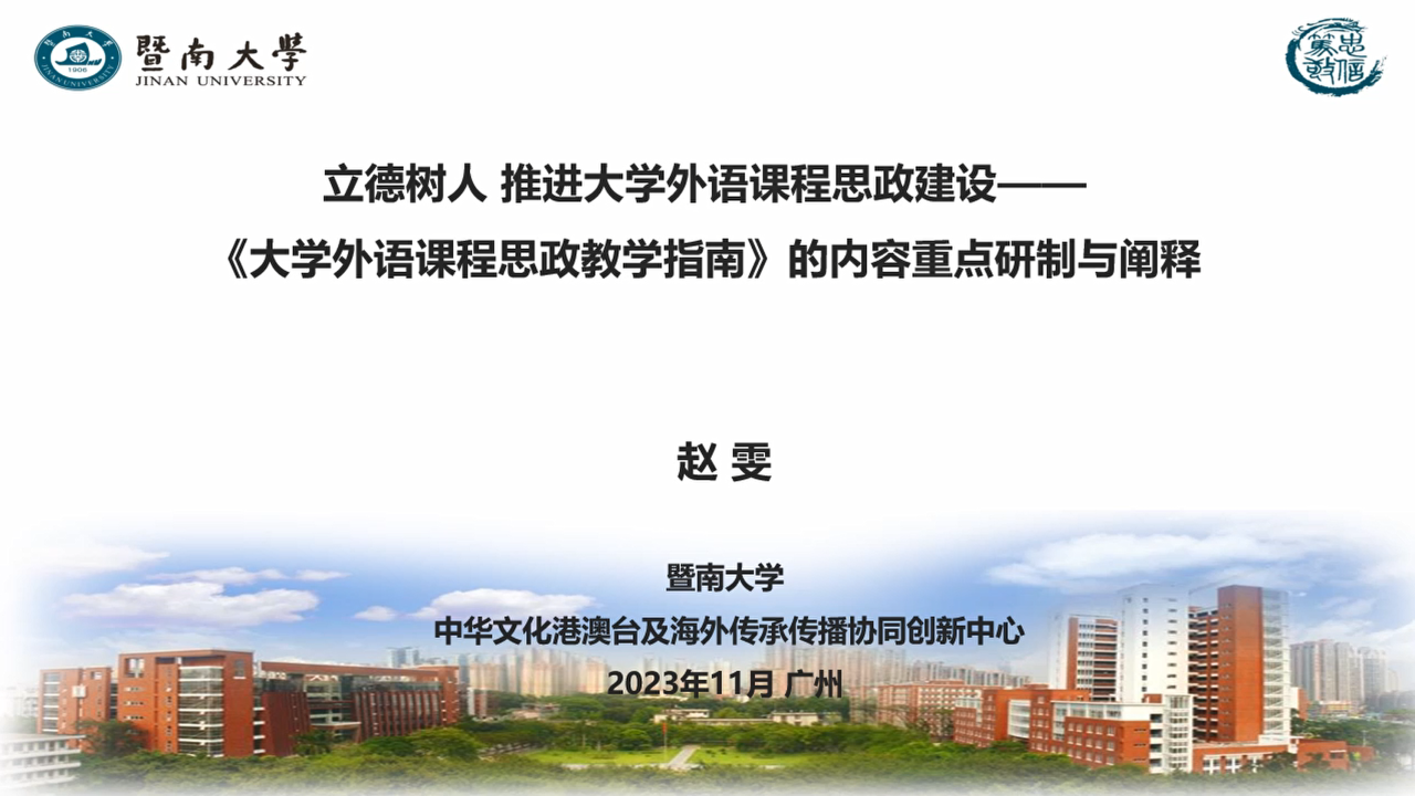 会后,与会学者对暨南大学太阳成集团tyc33455cc官网院长赵雯教授的题为“立德树人,推进大学外语课程思政建设——《大学外语课程思政教学指南》的内容重点研制与阐释”的主旨报告进行了深入学习。赵雯教授重点阐述了《大学外语课程思政教学指南》中“内容重点”的研制,介绍了基于课程思政内容重点开展的问卷调查和差距需求分析,阐释了课程思政内容重点的5个方面,并从课程论视角论述了《大学外语课程思政教学指南》与《大学英语教学指南》之间的关系,以期在新时代大学外语教学中发挥有效的指导作用。