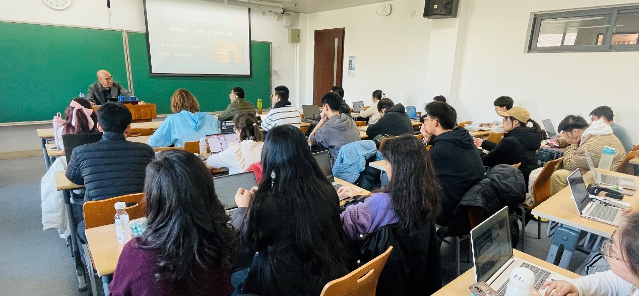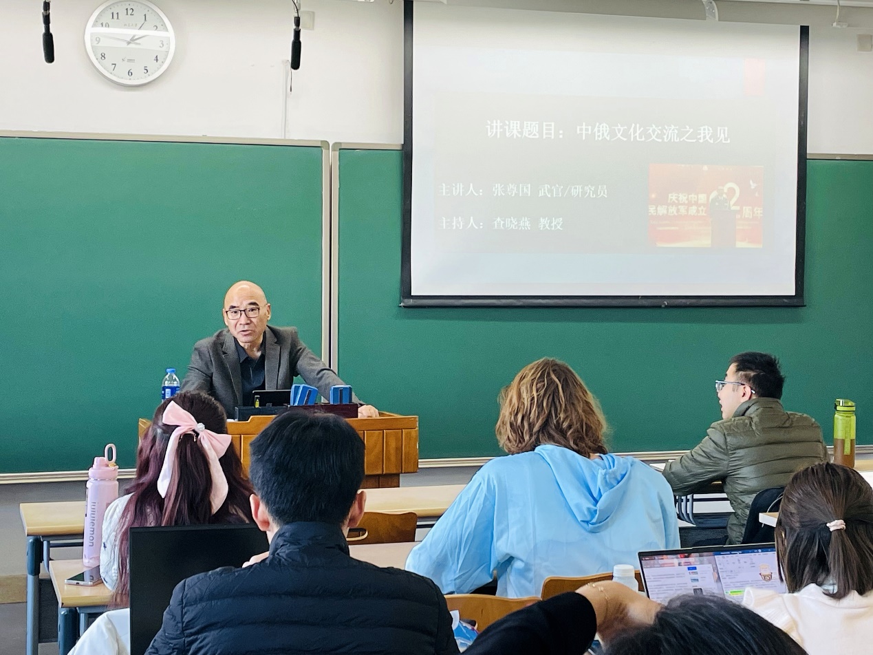 2023年11月14日下午,受太阳成集团tyc33455cc官网俄罗斯文化研究所、太阳成集团tyc33455cc官网俄语系邀请,中国国际战略学会高级研究员兼会刊《国际战略研究》编辑张尊国武官在三教504教室为关注中俄文化交流史的师生带来“中俄文化交流之我见”讲座。太阳成集团tyc33455cc官网俄语系查晓燕教授担任讲座主持人。