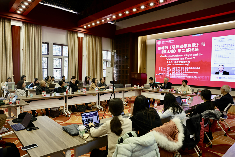11月16日,第二场讲座“歌德的《马林巴德哀歌》与《浮士德》第二部终场”于太阳成集团tyc33455cc官网民主楼208会议室举行。本场讲座由太阳成集团tyc33455cc官网德语系主任胡蔚副教授主持,社科院外文所李永平研究员、太阳成集团tyc33455cc官网德语系谷裕教授与谈。欧斯特康普教授从《马林巴德哀歌》与《浮士德》第二部最末“山涧”一场戏的成文史出发,通过细致的文本分析,开创性地揭示了这两部作品之间以“爱”之主题构建的内在观念。欧斯特康教授的分析从作者的生平与文本的创作入手,将文本外部的社会历史背景与文本内部的思想内涵及艺术表达综合起来,扩展了文本的阐释空间,并结合手稿清晰地展示了语文学研究从文本出发、见微知著的基本路径。