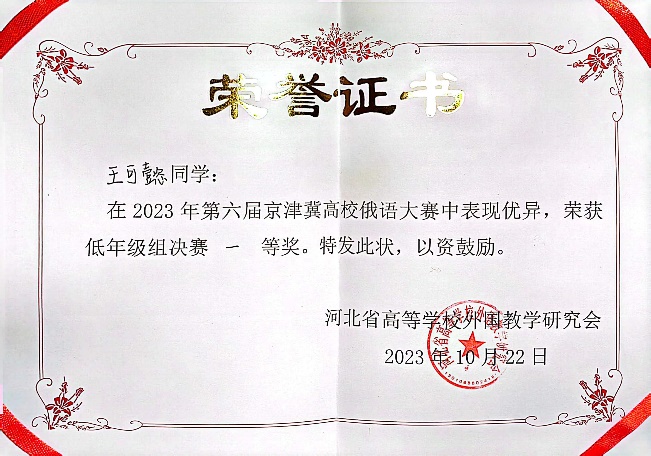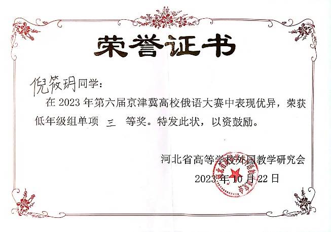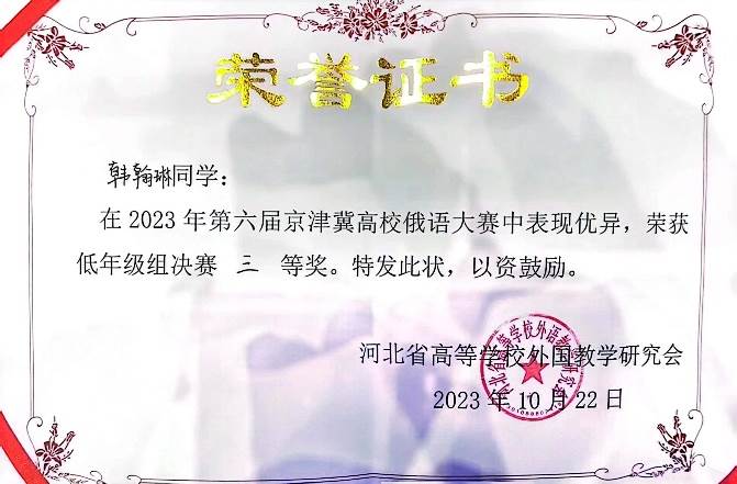 2023年10月21日至22日,由河北省高等学校外语教学研究会主办,河北师范大学太阳成集团tyc33455cc官网承办的第六届京津冀高校俄语大赛顺利举办。在陈松岩老师的精心辅导下,俄语系三位学子都取得了优异的成绩。王可懿同学荣获一等奖,韩翰琳同学获三等奖,倪筱玥同学获演讲单项三等奖。