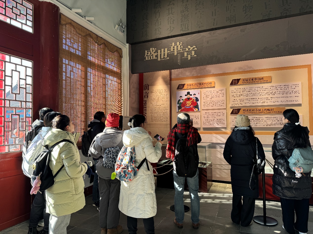 同学们实地学习到了苏禄国历史、苏禄王进出北京路线和彼时访问盛况,以及苏禄东王后人在中国的发展情况。通过参观展品和老师的讲解,同学们充分了解了自苏禄东王访华至今这600余年,中菲两国基于此渊源多次开展友好交往的史实。