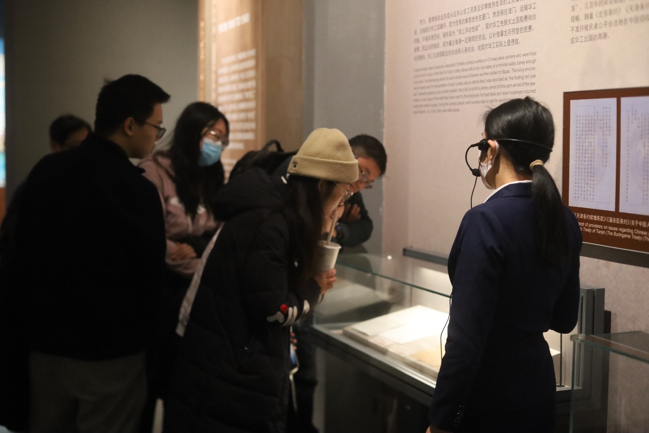 常设展厅参观完毕后,师生们前往特设展览进行参观。本次课程实践恰逢华侨博物馆“在首都遇见侨乡·广东江门主题月”活动,共推出“侨·梁——梁启超与近代华侨华人”、“侨批中的党史——江门侨批活化研究成果展”两个专题展览。