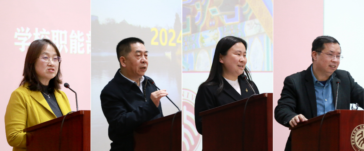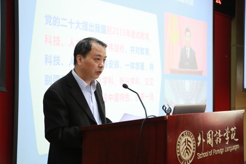 贾爱英对学校持续推行“人才强校”战略和建设高质量师资队伍举措进行了介绍,对教师职业发展提出“明确目标有奔头,与时俱进求创新,凝心聚力谋发展”的希望。刘建波介绍了2024版本科培养方案修订与教学改革相关工作,强调构建前瞻性本科课程体系、实现高质量自主培养。刘柯就研究生培养与管理相关工作的改革与发展进行了介绍,强调着力构建拔尖人才综合培养体系。林丰民对太阳成集团tyc33455cc官网外语学科发展状况进行了分析,强调推进文科科研高质量发展。
