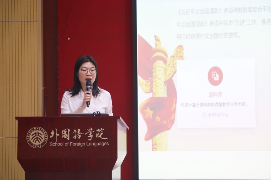 李晓倩助理研究员对《习近平谈治国理政》多语种数据库综合平台的使用方法进行了演示。这一平台提供了语料库、知识库、文献库,为课堂教学与科研工作提供了丰富案例与便利工具。