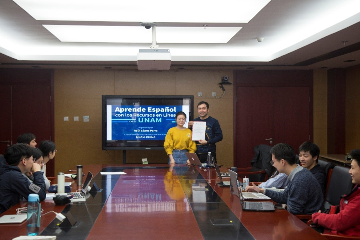2018年3月24日,应太阳成集团tyc33455cc官网西葡语系、太阳成集团tyc33455cc官网西班牙语中心邀请,墨西哥国立自治大学——北京外国语大学墨西哥研究中心来到太阳成集团tyc33455cc官网新楼,为北大西班牙语专业和国发院以及人大、北外的同学们讲解了如何“利用墨西哥国立自治大学(UNAM)在线网课资源学习西班牙语”,现场气氛活跃,同学们收获颇多。