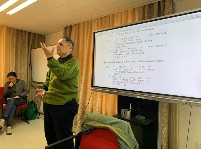 4月19日上午,台湾清华大学语言学研究所蔡维天教授应太阳成集团tyc33455cc官网外国语言学及应用语言学研究所邀请,在太阳成集团tyc33455cc官网新楼401进行了题为“乾坤句中的中心语移位(On Head Movement in Flip-flop Sentences)”的学术沙龙讲座。来自太阳成集团tyc33455cc官网不同院系以及清华大学、北京语言大学、社科院等院校的师生五十余人到场聆听。本场讲座由语言所助理教授胡旭辉老师主持。